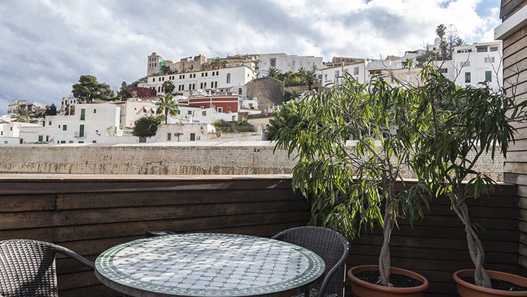 La terraza es compartida con los otros dos Áticos, pero a uso privado de estas. Ofrece vistas a la plaza y a la ciudad antigua (Dalt Vila), tumbonas, mesa con sillas y toldos media sombra.
