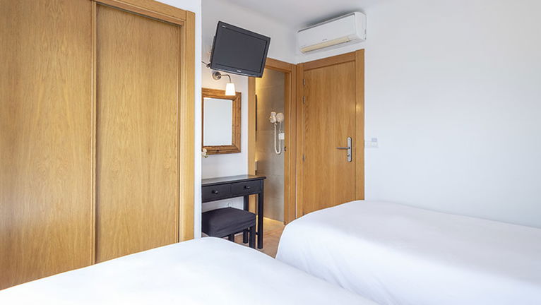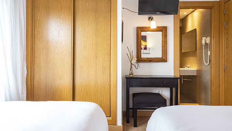 Esta habitación dispone de dos camas individuales (combinables), aire acondicionado, suelo de madera, Wifi gratuita, TV de pantalla plana, caja fuerte.