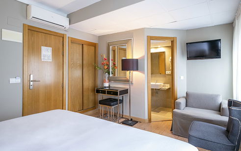 Dispone de cama doble extragrande, vistas centrales a la plaza, aire acondicionado, suelo de madera, Wifi gratuita, TV de pantalla plana, caja fuerte y mini-nevera.
